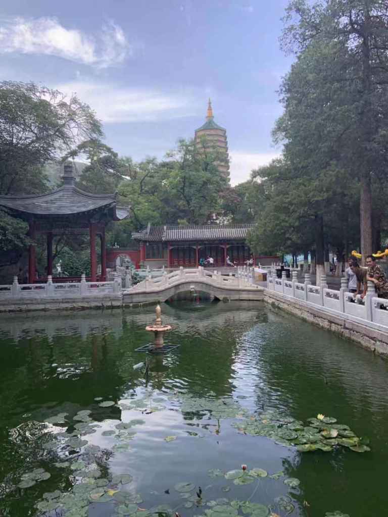 Pond, Sanshan Nunnery (三山庵) and view on the Temple of Divine Light (灵光寺)